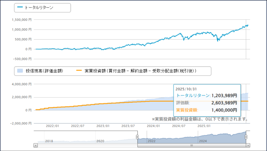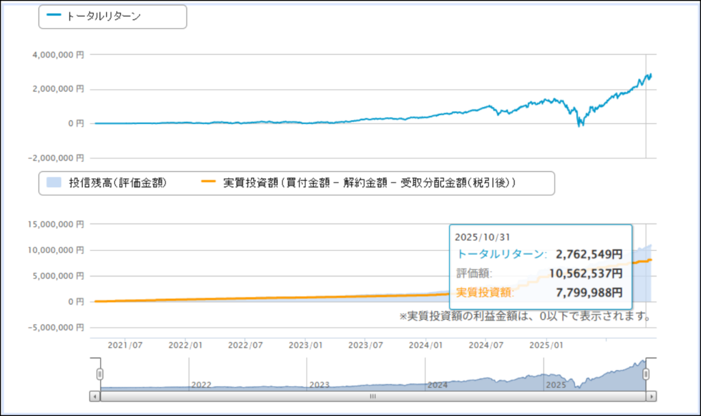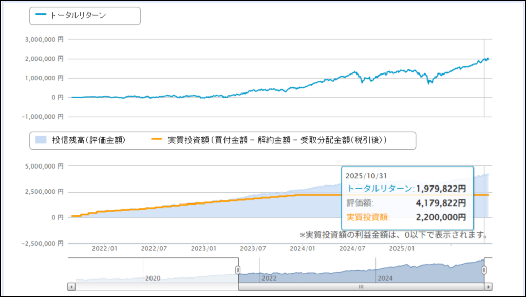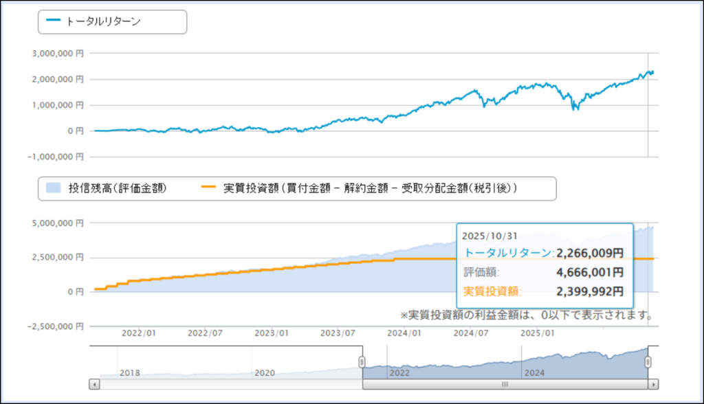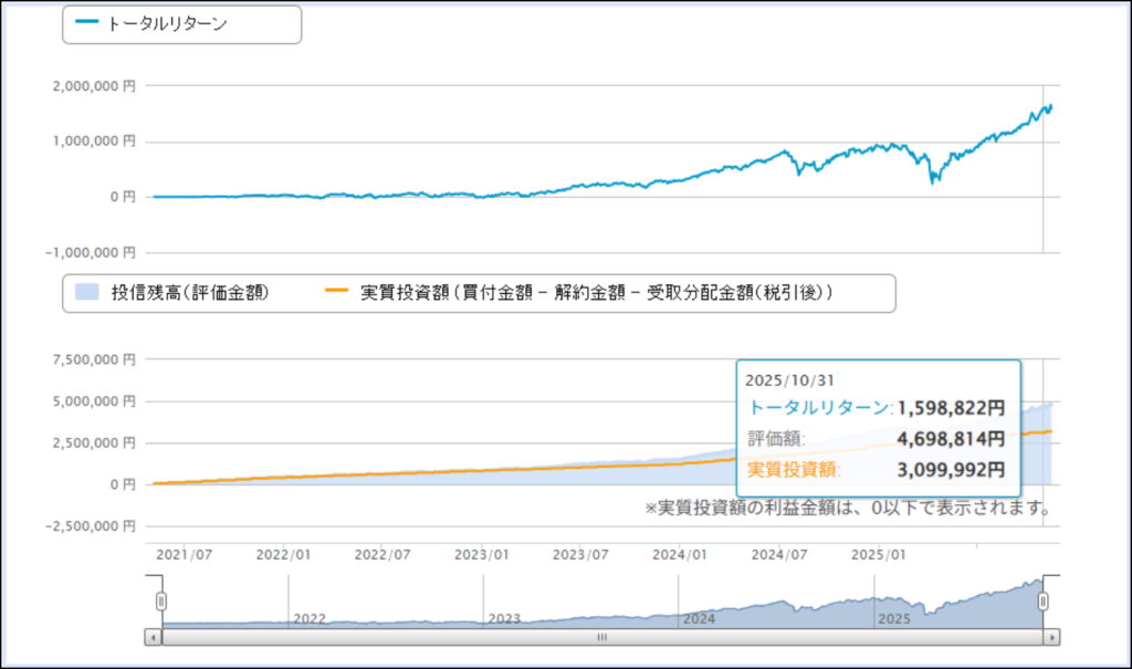 | eMAXIS Slim 全世界株式(オール・カントリー) | 全世界 | 2021.5~2025.10 | 310万円 | 469万円 | +51.6% |